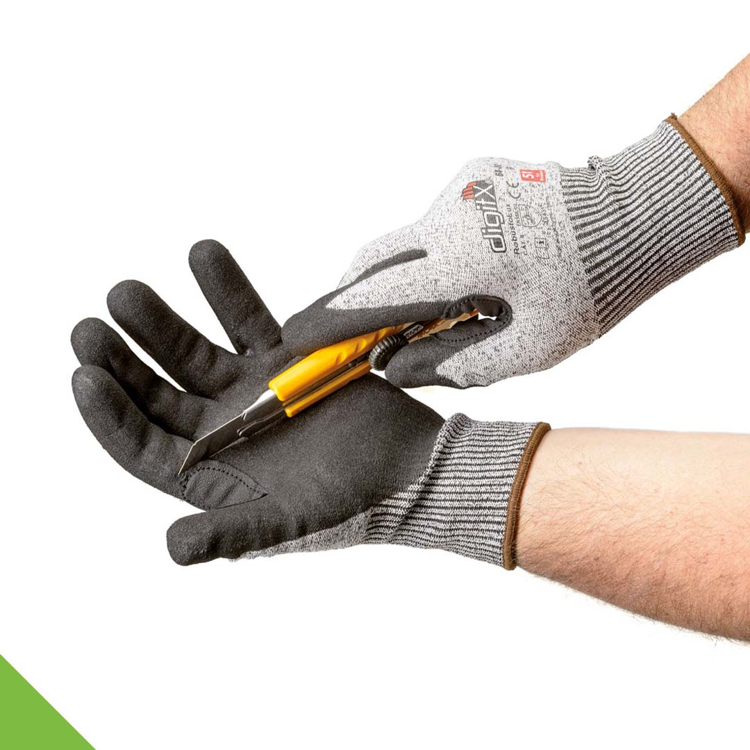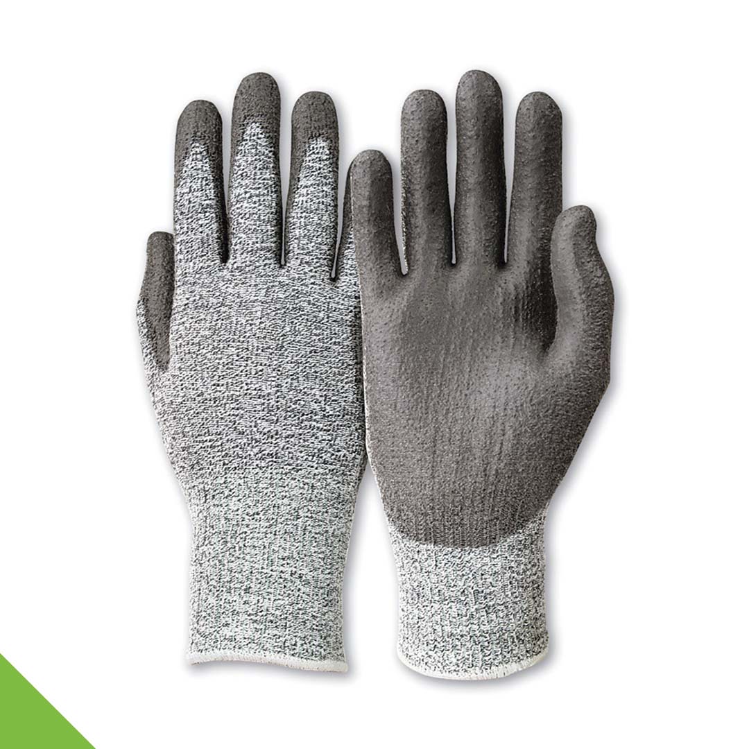Acc. to EN 420, EN 388 (4341). Seamless grey-flecked jersey made of HPPE fibres (polyethylene) with knitted cuff and black polyurethane coating on the palm and fingers